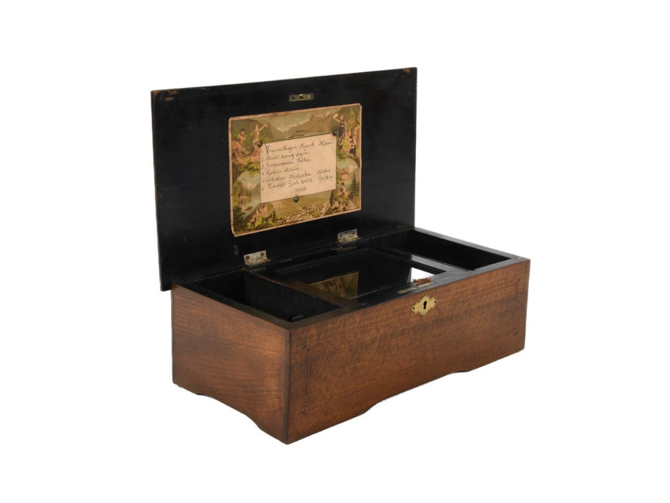 Les anciennes boîtes à musique à cylindre suisses peuvent avoir un son chaud et plein qui est différent des pièces plus récentes, surtout lorsque le boîtier est en noyer épais. Beaucoup ont été réalisés avec plusieurs airs, et des chansons sur le thème de l’hiver apparaissent parfois dans des sets axés sur les vacances. Lorsque vous magasinez, écoutez un volume uniforme sur la mélodie et les notes de basse, car les sections faibles peuvent indiquer des pièces usées.