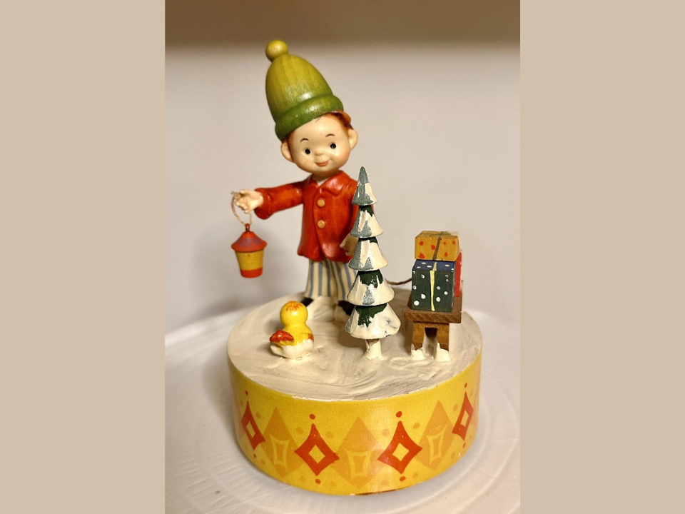 Les boîtes à musique en bois Anri sont connues pour leurs figures sculptées à la main, et les scènes hivernales sont parmi les modèles les plus populaires. Ceux-ci montrent souvent des chanteurs, des villages enneigés ou des thèmes forestiers qui correspondent bien aux expositions saisonnières.