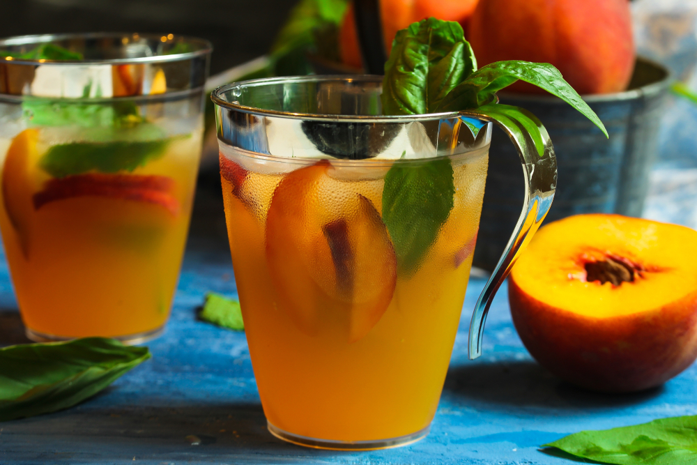 Écrasez les tranches de pêches fraîches et les feuilles de basilic dans un verre pour libérer leur jus naturel. Ajouter le jus de citron et le sirop d’agave en remuant pour combiner. Remplissez le verre de glaçons et complétez avec de l’eau gazeuse pour faire entrer les bulles. Remuer doucement et garnir d’un brin de basilic ou de tranches de pêche supplémentaires pour une finition rafraîchissante et visuellement attrayante.