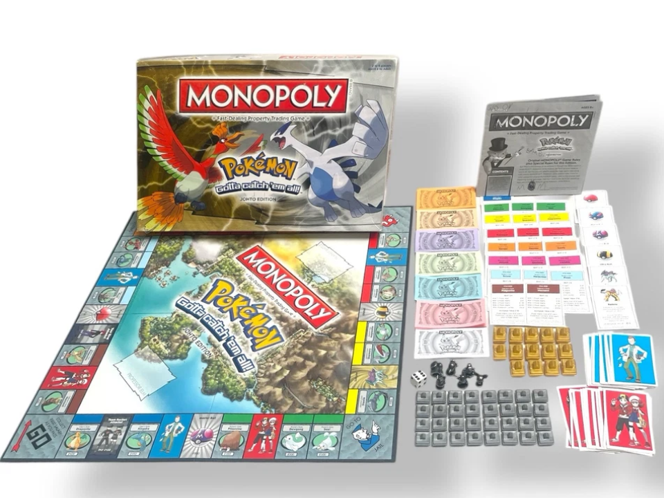 En 2001, Hasbro a publié l’édition Johto de Pokémon Monopoly, présentant des lieux de la région de Johto. Cette édition est conçue pour les 8 ans et plus et suit les mêmes règles de base du Monopoly mais avec une touche Pokémon. La rareté du jeu est attribuée à sa petite série de production et à l’intérêt croissant pour la collection de jeux Pokémon. En conséquence, il peut se vendre entre 100 et 250 dollars, surtout si la boîte et les composants sont intacts.