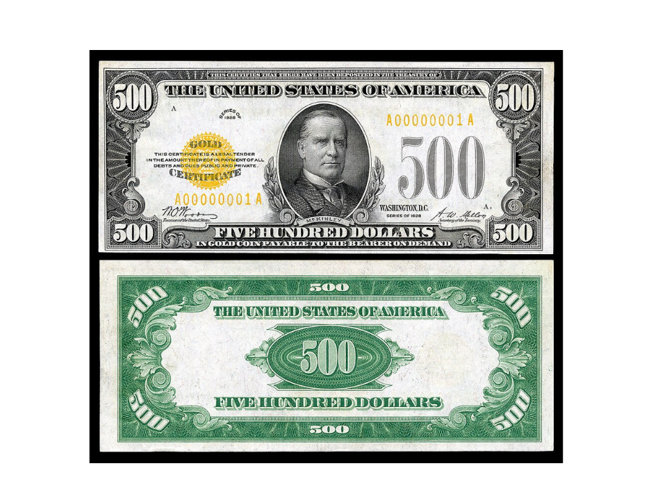 Le billet de 500 $ de 1928 est une autre pièce de monnaie rare, représentant un portrait du président William McKinley. Ces billets ont été émis avant les changements de série en 1934 et étaient utilisés pour des transactions de grande valeur. Les billets vedettes pour le billet de 500 $ de 1928 sont extrêmement rares, et quelques exemplaires restent encore en circulation.