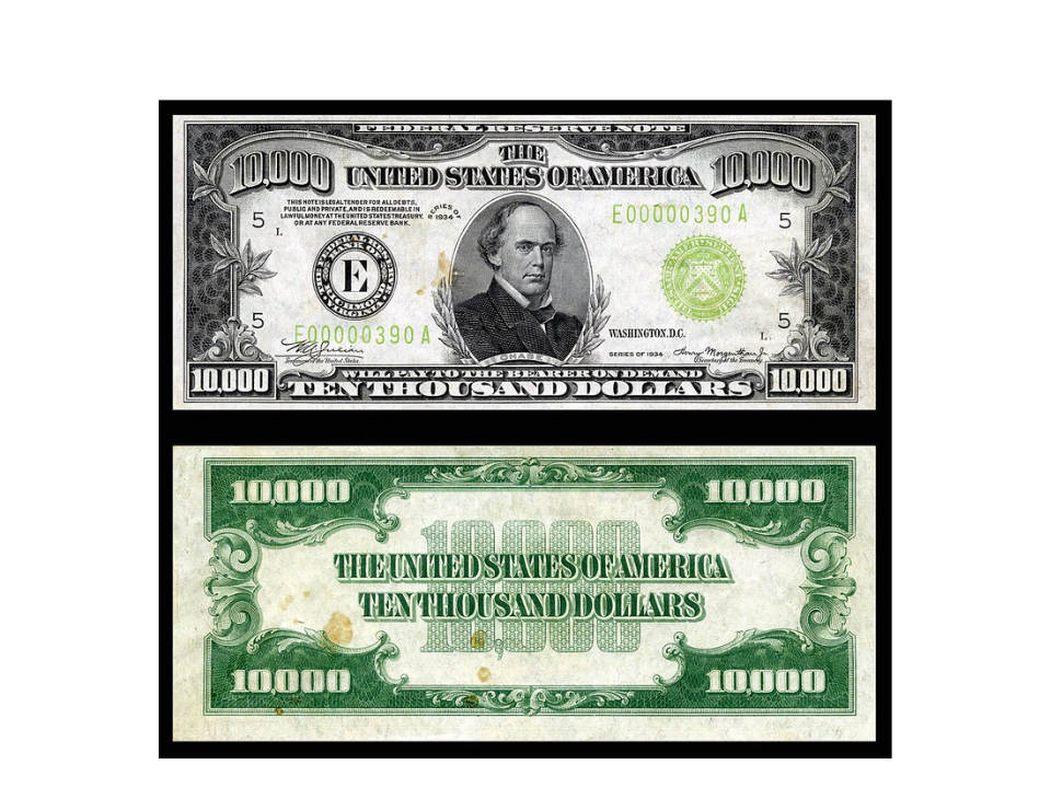 Le billet de 10 000 $ de 1934 a été émis à une époque où les grosses coupures étaient nécessaires aux transactions commerciales. Ces billets présentent un portrait de Salmon P. Chase, secrétaire au Trésor sous le président Lincoln. Les notes étoilées de cette série sont très rares et recherchées par les collectionneurs sérieux.