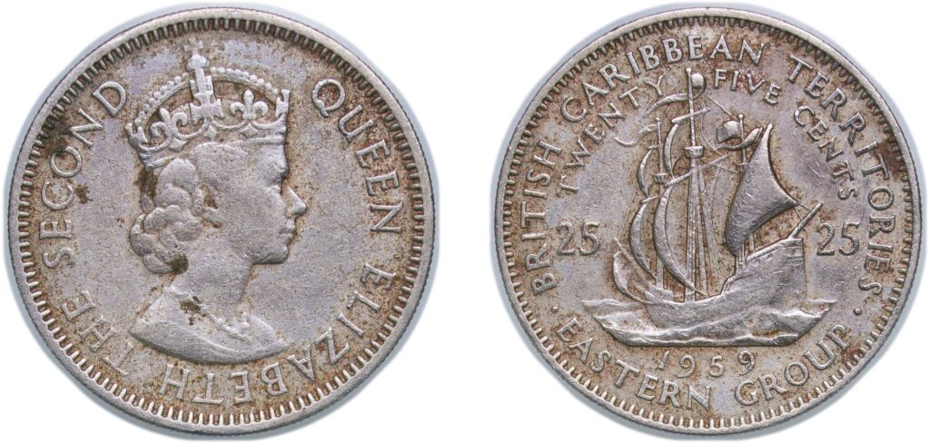 La pièce de 25 cents des Antilles britanniques, frappée entre 1948 et 1959, représente la région avant sa transition vers diverses nations indépendantes. Représentant le portrait du monarque britannique, cette pièce est évaluée entre 25 $ et 100 $. Il s’agit d’un objet de collection très recherché en raison de son lien avec l’histoire coloniale des Caraïbes. Le système monétaire des Antilles britanniques a été remplacé à mesure que les différents pays sont devenus indépendants, ce qui rend ces pièces rares aujourd’hui.