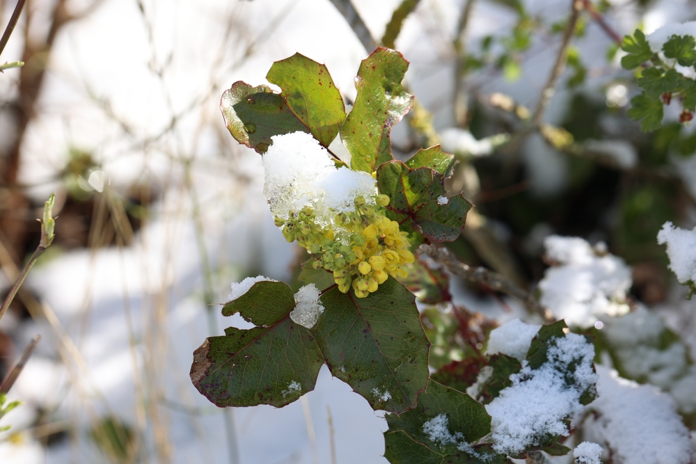 Mahonia a de longues feuilles épineuses qui restent d’un vert foncé tout au long de l’hiver. Le froid peut faire ressortir les tons rouges ou bronze. Les feuilles épaisses aident à protéger la plante du gel. La neige cause généralement peu de dégâts.