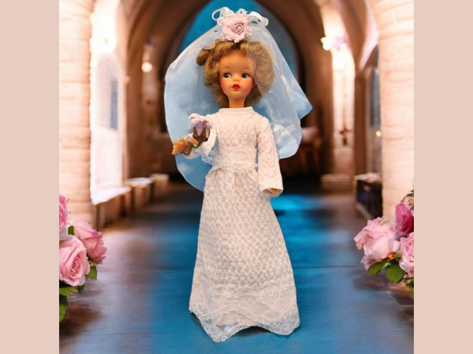 Le mariage de Tammy Blonde Bride capture un moment de célébration qui se démarque dans les souvenirs de poupées. Cet ensemble comprend une mariée Tammy avec son voile et son bouquet ainsi qu’un marié vêtu d’une tenue formelle. De minuscules détails comme la bordure en dentelle sur les boutons de la robe du costume et les fleurs miniatures ravissent les collectionneurs qui aiment une observation attentive.