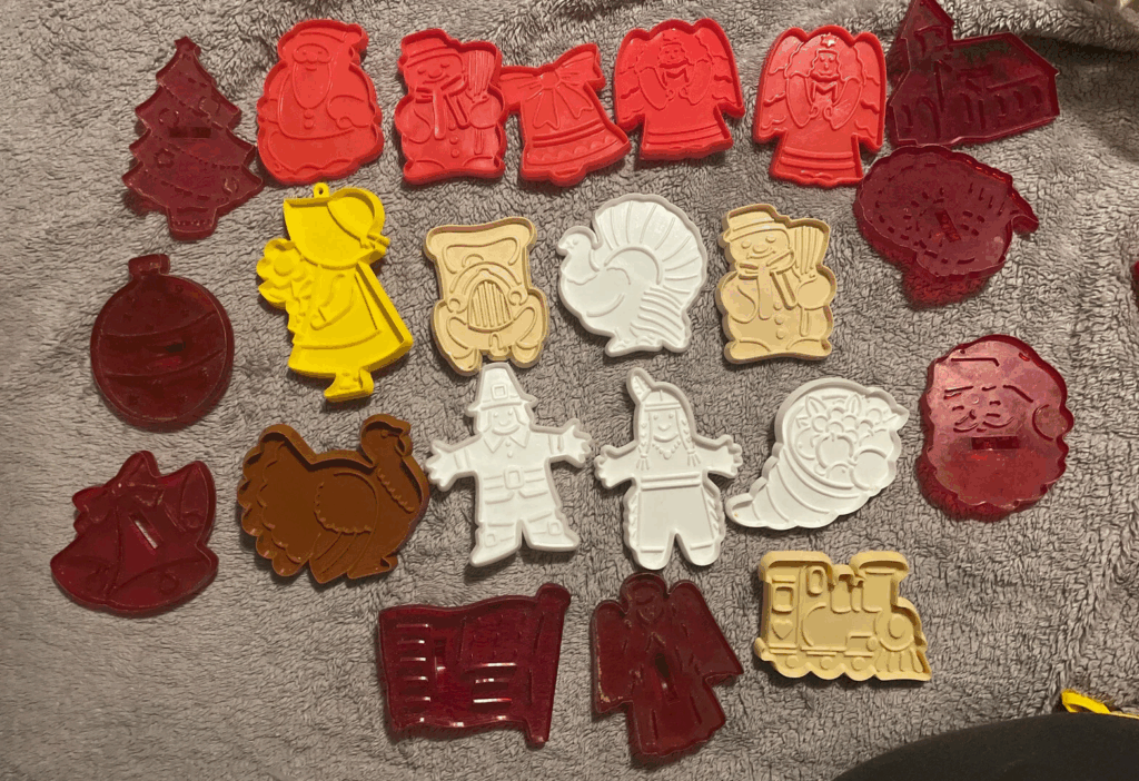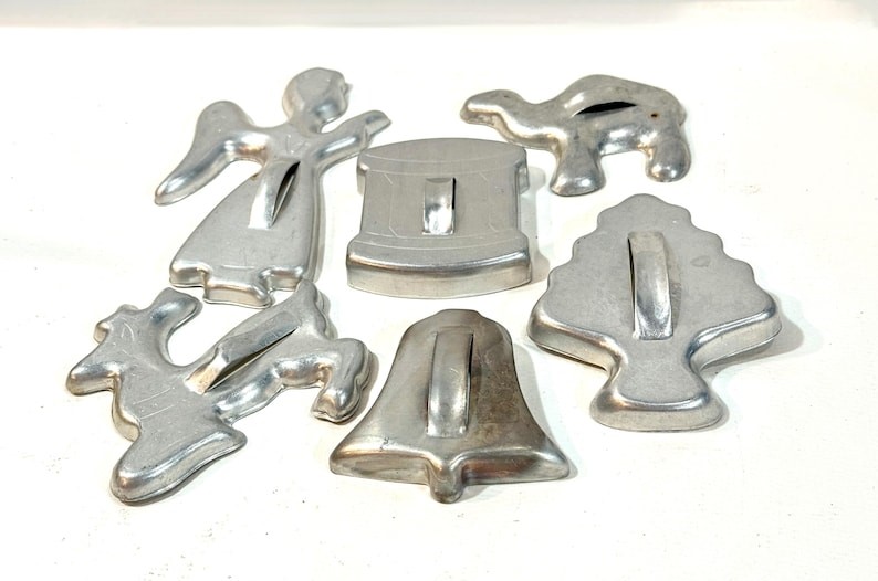 Cet assortiment Wear-Ever remonte aux années 1950 et comprend des formes saisonnières en aluminium léger. De nombreux collectionneurs apprécient les produits Wear-Ever car ils représentent une époque forte des ustensiles de cuisine américains. Les ensembles comprennent souvent des cloches, des arbres, des étoiles et des figurines en pain d’épice. Les valeurs se situent généralement entre 20 et 30 dollars américains. Les lots contenant plusieurs formes ont tendance à être plus attrayants.