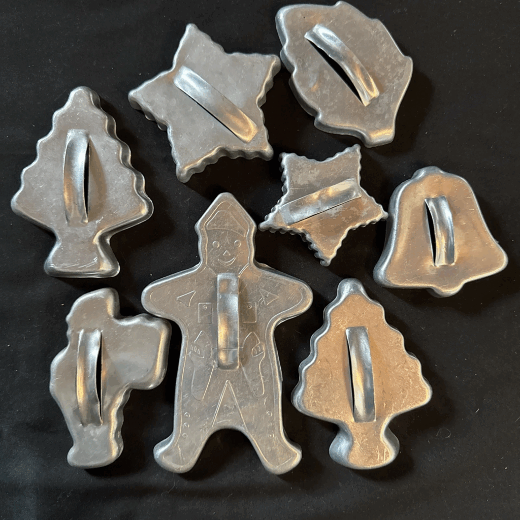 Ces emporte-pièces à manche des années 1950 comprennent des cloches, des figurines en pain d’épice, des étoiles et des arbres. Leurs petites poignées surélevées les rendaient plus faciles à saisir, ce qui leur conférait une place unique dans les ustensiles de cuisine du milieu du siècle. Les collectionneurs les apprécient car ils représentent une conception de transition dans l’histoire de l’emporte-pièce. Un lot typique se vend entre 22 et 28 dollars américains. Les ensembles dotés de poignées robustes attirent le plus l’attention.