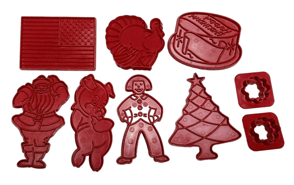 L’ensemble Merry Xmas est apparu pour la première fois à la fin des années 1940 sous la marque bien connue Aunt Chick’s. De nombreux collectionneurs recherchent cet ensemble en raison de son plastique rouge vif et de ses charmantes formes vintage. L’ensemble comprend généralement des motifs tels que le Père Noël, un arbre, une étoile et un bas. Les valeurs ont tendance à se situer entre 20 et 30 dollars US selon les conditions. Les ensembles avec des inserts de recettes se vendent souvent dans le haut de gamme.