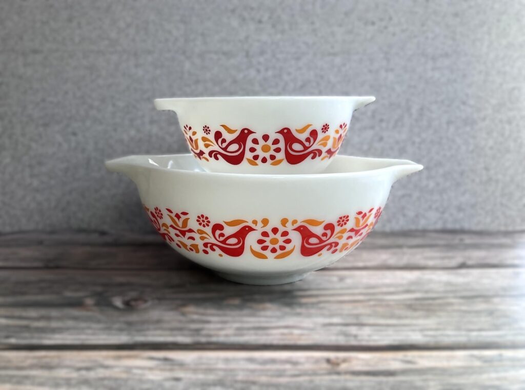 L’amitié possède l’un des looks d’oiseaux et de fleurs les plus reconnaissables du monde Pyrex. Le motif date du début des années 1970 et le design rouge et orange lui donne une sensation vivante sans perdre son aspect vintage et chaleureux. Les collectionneurs du printemps l’apprécient souvent car le motif est chaleureux, floral et plein de mouvement. Les pièces typiques et les petits ensembles se situent souvent entre 90 et 315 dollars.