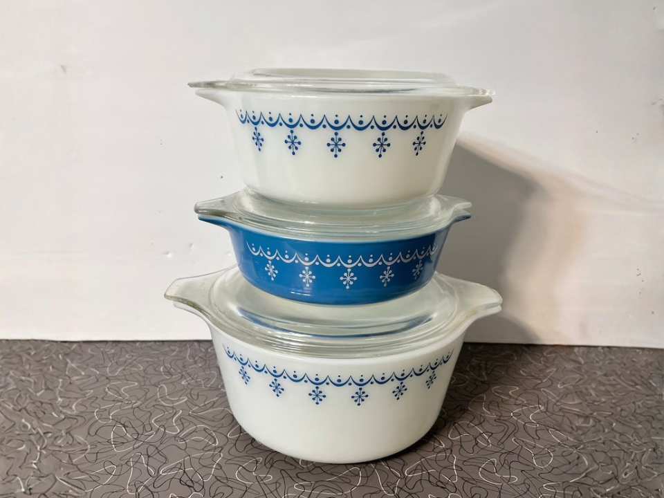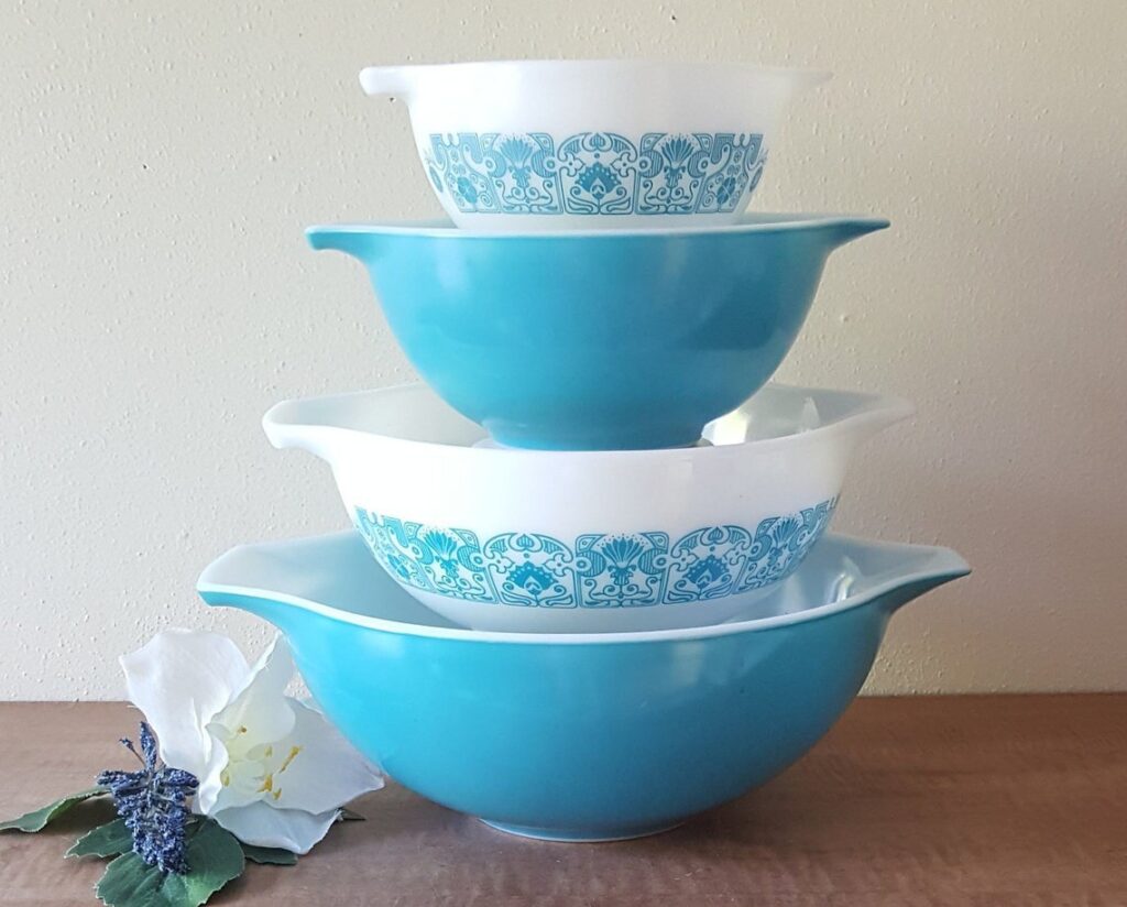 Beaucoup de collectionneurs aiment celui-ci car il est toujours facile à utiliser, à empiler et à afficher. La couleur fonctionne bien au printemps car elle se marie bien avec les étagères blanches, les draps fleuris et autres verreries vertes. De lourdes marques d’ustensiles à l’intérieur des bols sont courantes, c’est donc l’une des premières choses que les acheteurs vérifient. Pour les nouveaux collectionneurs, il s’agit souvent d’un moyen convivial d’accéder au Pyrex vintage.