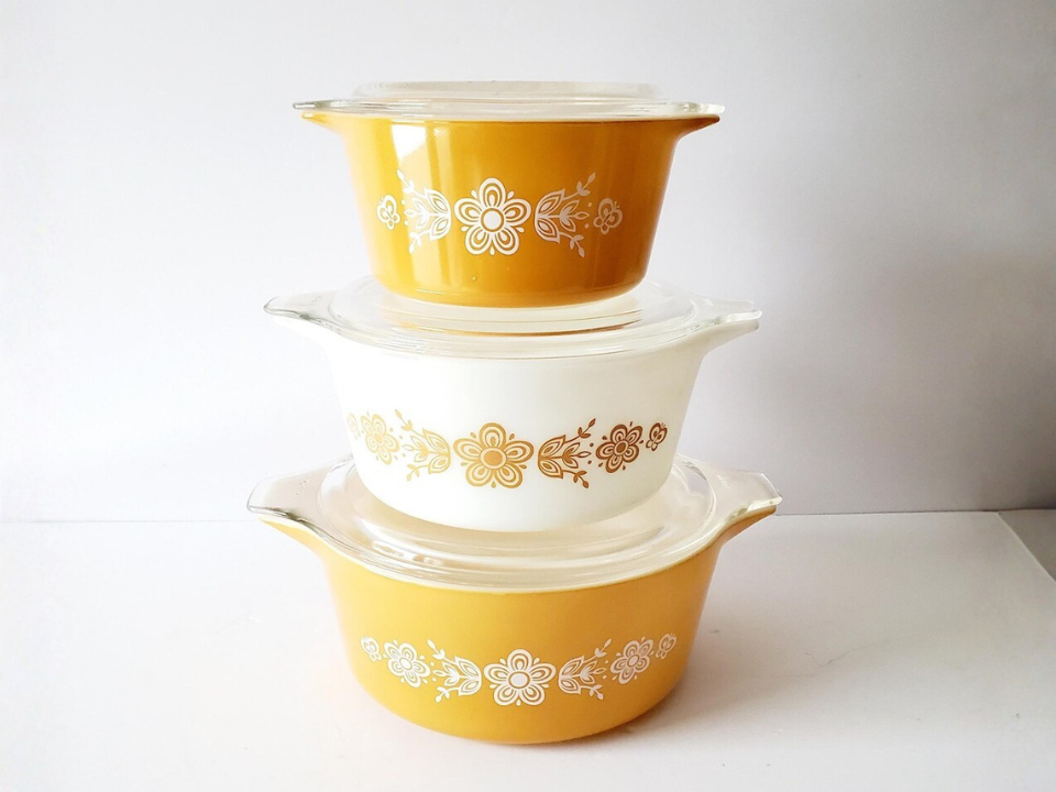 Butterfly Gold reste l’une des gammes Pyrex les plus connues des années 1970. Le motif mélange des papillons et des fleurs dans des tons chauds jaunes et dorés, ce qui lui donne un look de cuisine ensoleillé que beaucoup apprécient encore au printemps. Il est assez courant de le collectionner sans trop de problèmes, même si les ensembles complets les plus propres se vendent toujours bien. Un ensemble de bols Cendrillon coûte souvent entre 130 et 220 dollars.
