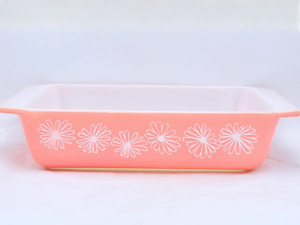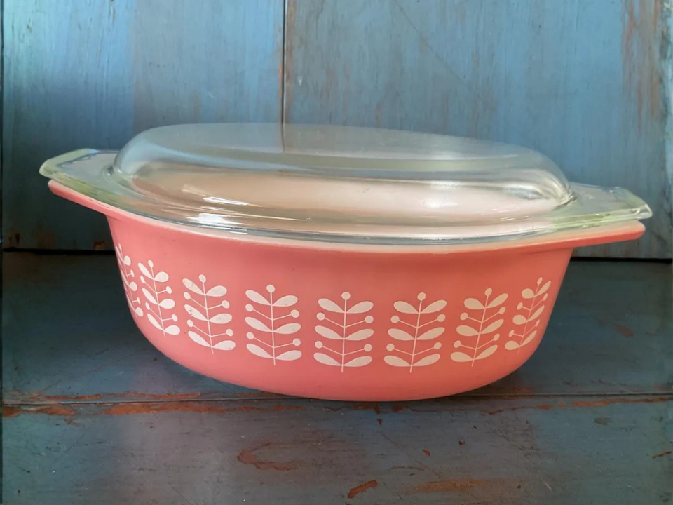 Pink Daisy fait partie de ces motifs qui se sentent instantanément liés aux températures plus chaudes et aux pièces plus claires. Les cocottes ovales courantes avec couvercles coûtent souvent entre 45 et 75 dollars, ce qui les rend plus accessibles que les lignes Pyrex roses les plus rares. Les collectionneurs l’apprécient pour son imprimé floral rose et la façon dont il ajoute de la couleur sans envahir un présentoir. Au printemps, il se marie particulièrement bien avec le verre de lait et les fleurs pâles.