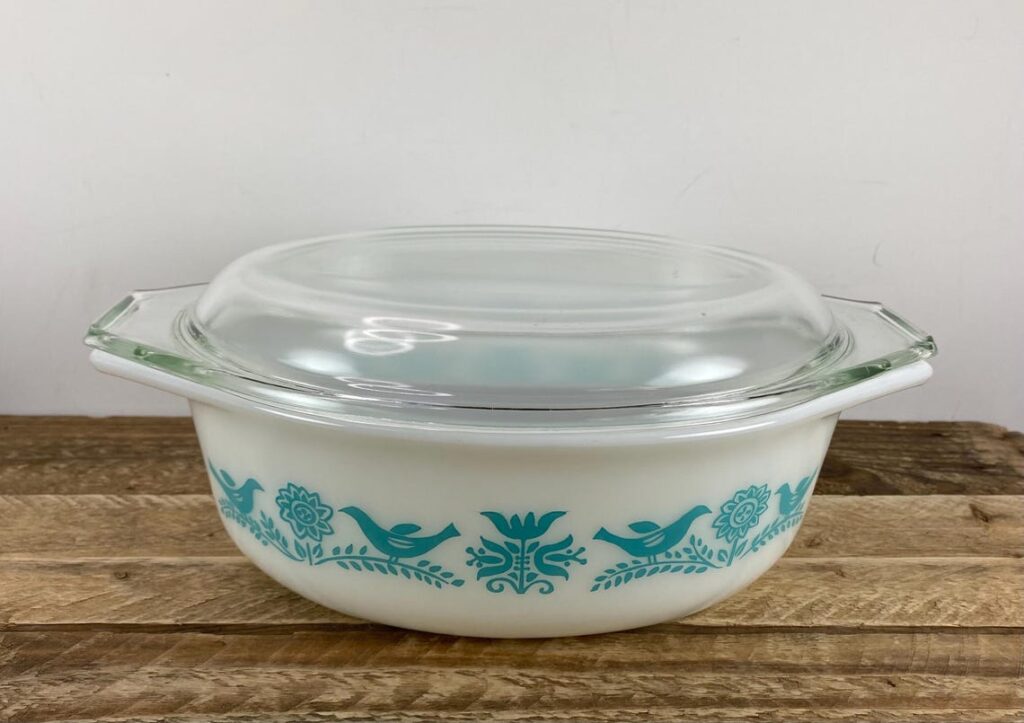Bluebird a un doux aspect d’oiseau et de fleur qui convient particulièrement bien au printemps. Ce modèle de cocotte promotionnel a été utilisé de 1959 à 1961, et les oiseaux turquoise sur verre blanc lui donnent une sensation plus légère que de nombreux modèles de cuisine plus sombres. Les collectionneurs ont tendance à l’apprécier car il se rapproche de Butterprint tout en ayant son propre look. Une cocotte ovale couverte se vend souvent entre 40 $ et 90 $.
