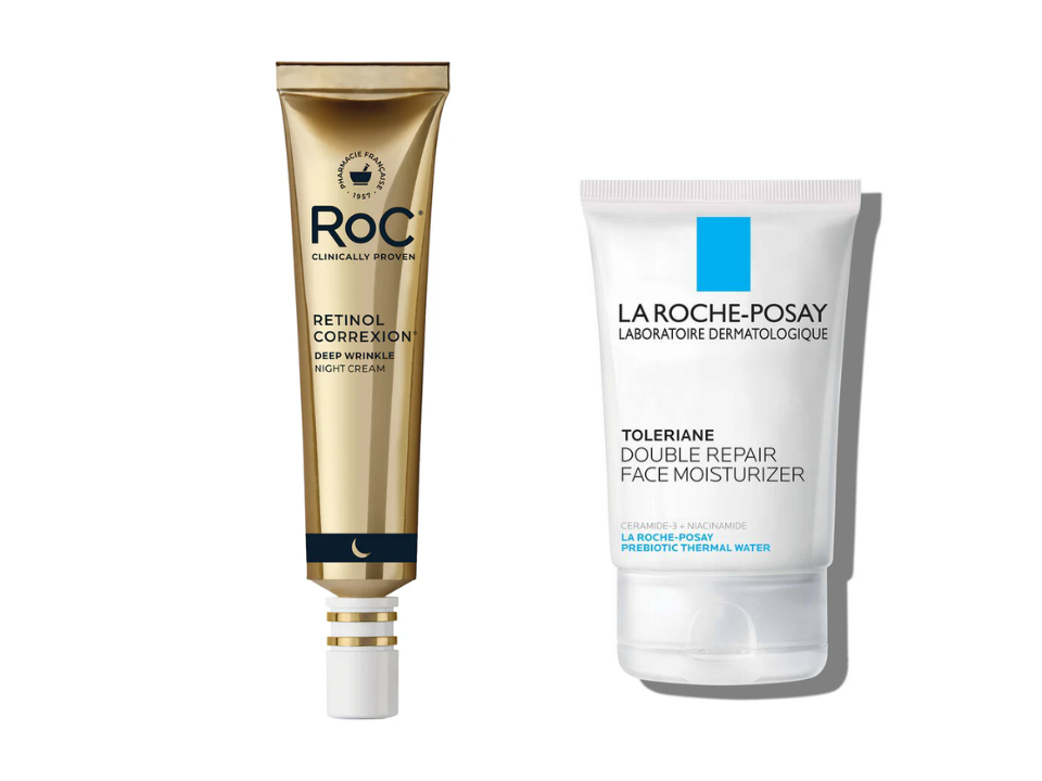 Crème de nuit rides profondes RoC Retinol Correxion et crème hydratante visage double réparation Toleriane La Roche-Posay