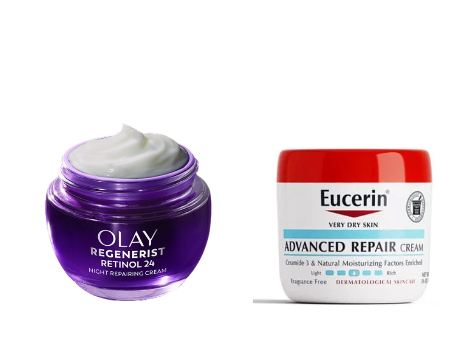Hydratant de nuit Regenerist Retinol 24 de Olay et crème réparatrice avancée Eucerin