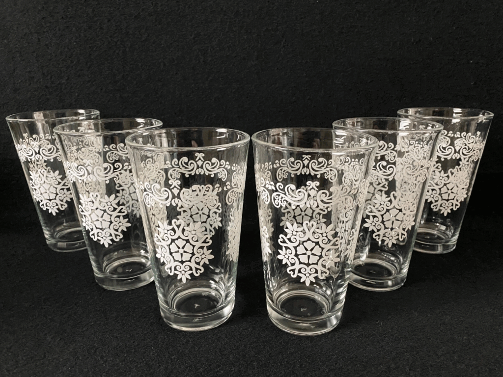 Les gobelets Libbey Spanish Lace apportent une touche de charme vintage aux boissons de tous les jours. Leur motif texturé ajoute un intérêt visuel sans paraître compliqué. Vous pouvez trouver un ensemble de quatre pour environ 80 $ à 140 $ selon la rareté et l’état. Ces gobelets fonctionnent bien pour l’eau, le thé glacé ou le punch lors des réunions. Les offrir en cadeau est une expérience attentionnée, surtout lorsqu’ils sont associés à un ensemble de serviettes en tissu.
