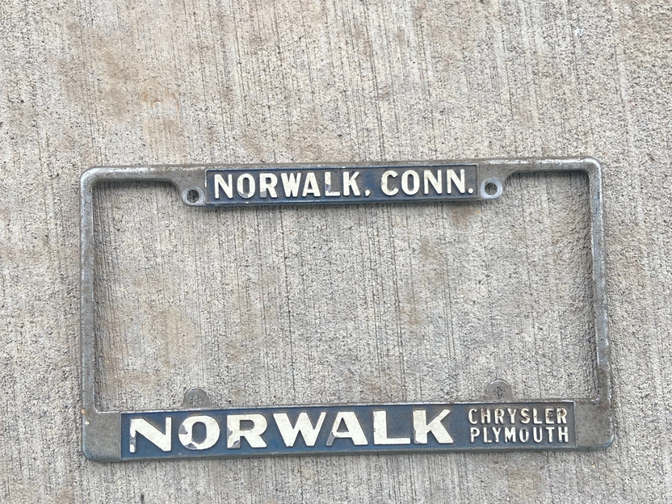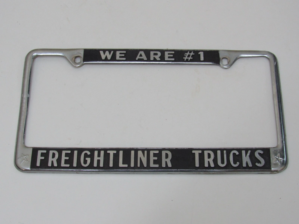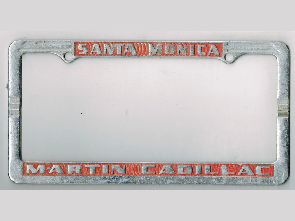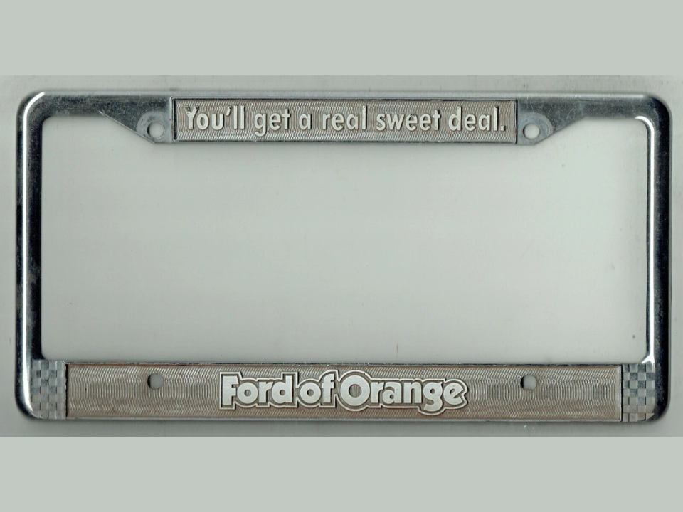 Ce cadre était distribué par un concessionnaire Ford aux clients qui achetaient des voitures neuves dans les années 1960. Il porte le nom du revendeur estampé sur le dessus et une finition chromée qui s’est émoussée avec le temps. Les personnes qui collectionnent des souvenirs automobiles apprécient leur lien avec un lieu et une époque spécifiques de l’histoire des ventes automobiles.