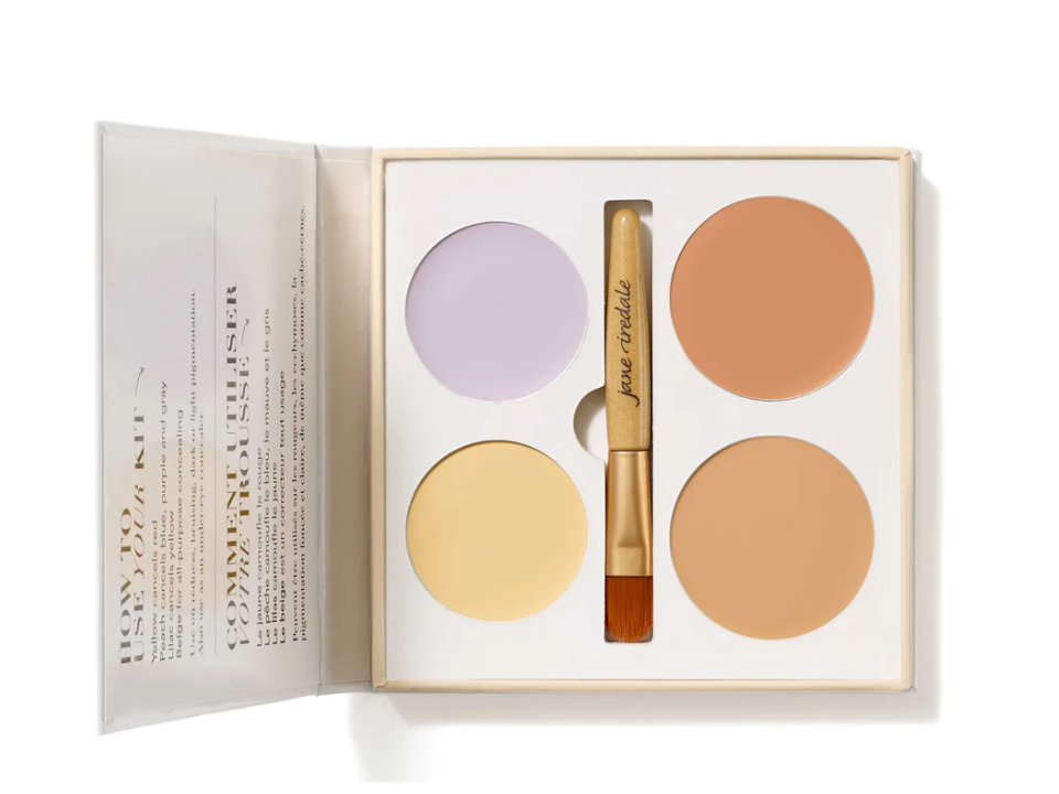 Un kit avec plusieurs tons peut vous aider lorsque vos cercles varient en couleur et en profondeur. Le kit de couleurs correctrices Jane Iredale vous permet de corriger en premier, afin que votre couche de correcteur reste légère. Utilisez-le une fois que votre crème pour les yeux a été absorbée, puis appuyez sur la bonne teinte correctrice là où se trouve l’obscurité. Mélangez jusqu’à ce que le mélange soit homogène, puis arrêtez avant d’en ajouter trop.