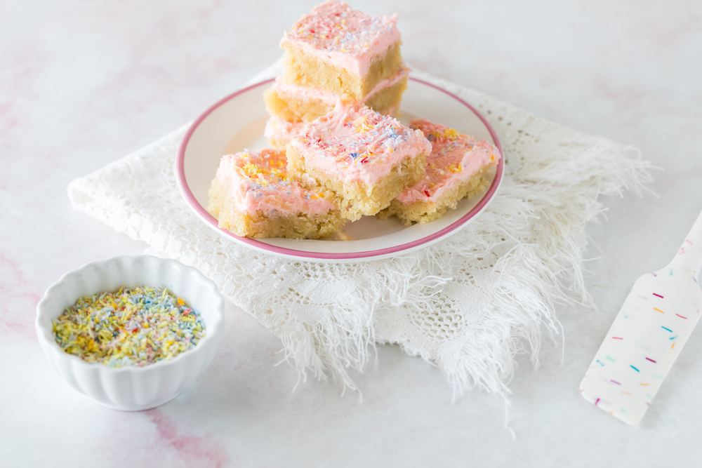Pour les barres de biscuits au sucre, vous aurez besoin de farine tout usage, de levure chimique, de sel, de beurre non salé, de sucre cristallisé, d’œufs, d’extrait de vanille et d’un peu de lait. Mélangez les ingrédients secs dans un bol et battez le beurre et le sucre dans un autre. Ajoutez les œufs et la vanille, puis mélangez les ingrédients humides et secs. Étalez la pâte dans un plat allant au four et faites cuire au four à 350°F (175°C) pendant environ 20-25 minutes. Une fois refroidi, glacez avec votre glaçage préféré et coupez en carrés.