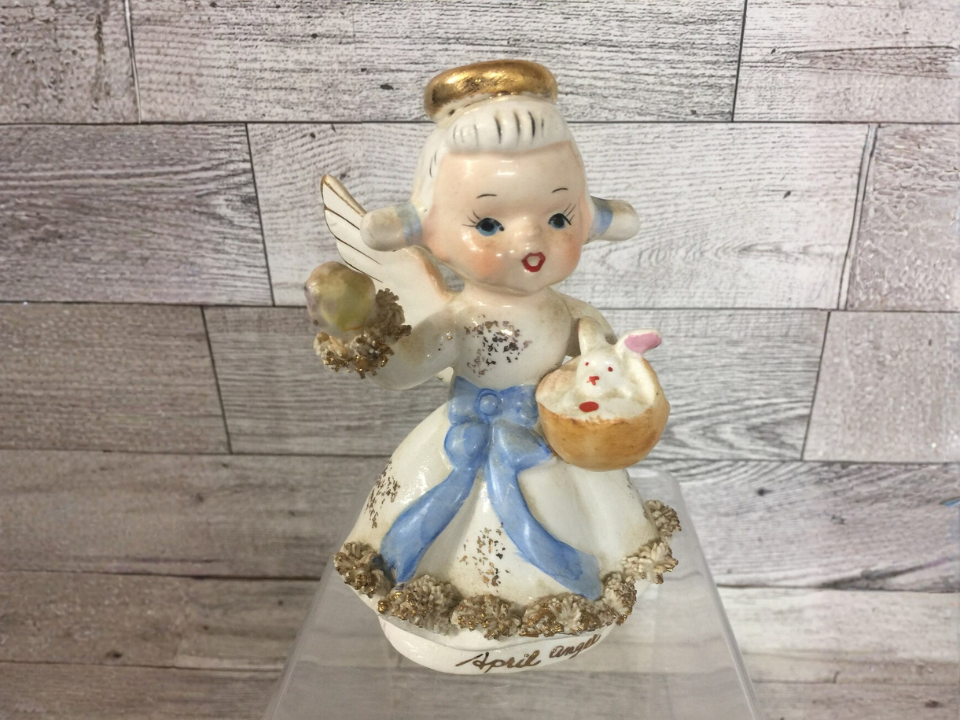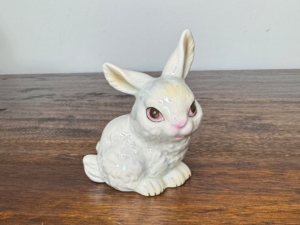 Certaines figurines printanières se démarquent parce qu’elles racontent une petite histoire, et c’est exactement ce que fait cet ange de Pâques de Lefton avec son lapin. Il est généralement décrit comme une figure en céramique japonaise des années 1950, avec des détails peints à la main et un aspect plus décoratif qu’un simple lapin. Ce travail de scène supplémentaire l’aide à attirer les personnes qui aiment la décoration de vacances vintage en général. Une fourchette de valeur réaliste se situe entre 40 et 50 dollars.