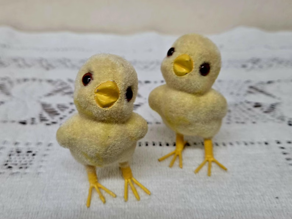 Josef Originals est connu pour ses expressions douces et ses détails ludiques, et une paire de poussins floqués jaunes correspond très bien à ce style. Les exemples vintage sont décrits comme des figurines en céramique japonaise avec une finition extérieure floquée qui leur donne un aspect doux et pelucheux. Cette texture explique en grande partie pourquoi ces poussins sont toujours choisis par les acheteurs. La valeur actuelle d’une paire en bon état est d’environ 18 $ à 28 $.