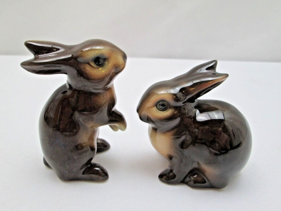 Une paire de petits lapins Napco aux yeux roses donne à une étagère un look printanier très classique du milieu du siècle. Celles-ci sont généralement décrites comme des figurines en céramique peintes à la main, fabriquées au Japon et vendues par paire assortie. Beaucoup de gens aiment les lapins en couple parce qu’ils remplissent parfaitement un petit espace et se sentent plus complets qu’une seule figurine. Une bonne valeur de travail se situe entre 15 et 20 dollars pour la paire.