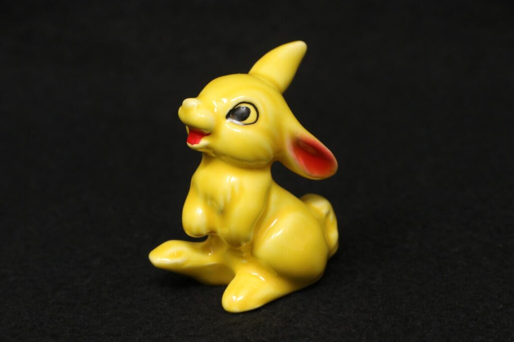 Cette figurine est un bon choix pour les personnes qui souhaitent qu’un lapin se démarque dans un groupe mixte. La plus grande taille lui permet de fonctionner comme une pièce avant dans un arrangement à ressorts. Les frottements de couleur peuvent apparaître plus clairement sur la glaçure jaune, l’usure de la surface est donc importante ici. Lorsque la finition reste brillante, la figurine a une présence très joyeuse.