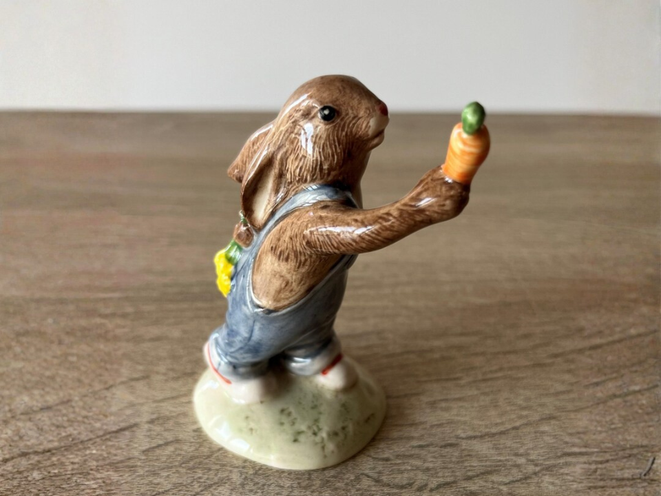 Il existe un public intégré pour le matériel de Beatrix Potter, ce qui permet à ce lapin de rester facile à apprécier. Benjamin Bunny a fière allure seul, bien qu’il s’intègre également bien aux côtés de Peter Rabbit et d’autres personnages de la même lignée. Le backstamp, l’usure de la peinture et l’état des oreilles peuvent tous modifier le prix. Lorsque les couleurs restent propres et que la figurine est intacte, cela donne un lapin de collection très agréable.