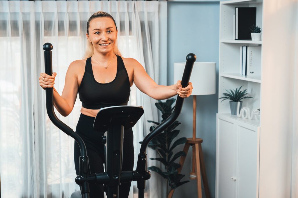 L’elliptique vous offre un mouvement fluide qui peut sembler plus doux que le jogging. Vos pieds restent sur les pédales, donc il n’y a pas de coups sur les articulations. Gardez la résistance et l’inclinaison faibles pour qu’elles restent confortables pour vos genoux. Tenez légèrement les poignées ou utilisez les bras mobiles si cela fait du bien à vos épaules.