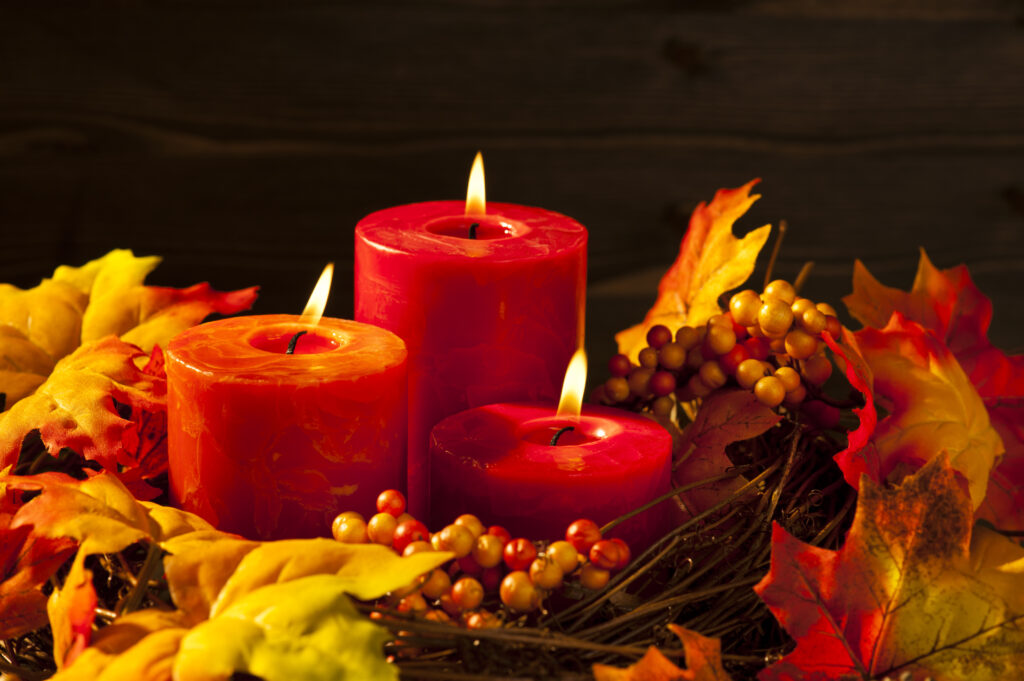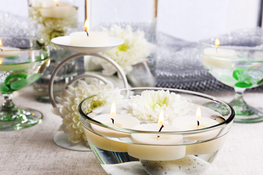 Un large bol en verre rempli d’eau devient la base des bougies flottantes. Disperser les canneberges ou les feuilles colorées sur la surface de l’eau pour plus de couleur. La réflexion vacillante dans l’eau crée une atmosphère apaisante.
