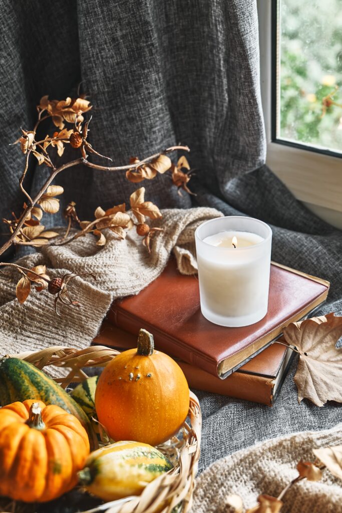 Empiler les livres vintage crée une base inattendue mais charmante pour une pièce maîtresse. Placer une petite citrouille, des fleurs séchées ou une bougie sur le dessus pour un écran en couches. Le mélange d’ancien et de nouveau ajoute du caractère à votre table.