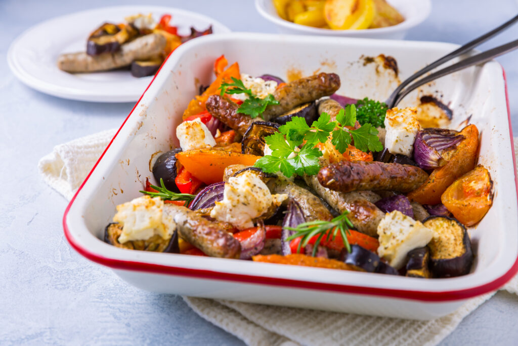 Bols de préparation de repas de saucisses rôties et de légumes d’hiver