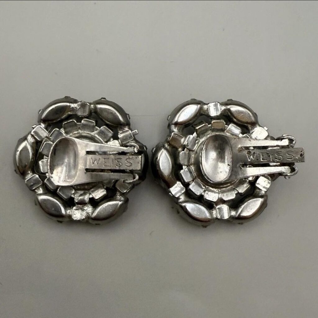 Les marques Weiss indiquent généralement WEISS en majuscules et sont souvent estampillées directement au dos d’une broche ou d’un clip de boucle d’oreille. Weiss est fortement lié au travail du strass, et l’éclat peut être impressionnant lorsque les pierres sont propres et présentes. De nombreuses pièces utilisent des pierres claires et brillantes, des navettes aux couleurs profondes ou des motifs de fleurs en couches qui se photographient bien. Si les couleurs de la pierre semblent vives et que les réglages semblent serrés, c’est ce que vous voulez.