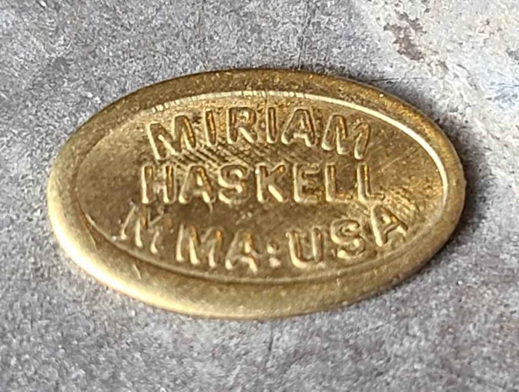 Les marques de Miriam Haskell se trouvent souvent sur une petite étiquette ovale qui peut être câblée sur la pièce plutôt que gravée directement dans le métal. De nombreux objets plus anciens ne sont pas marqués, une étiquette est donc utile mais n’est pas obligatoire pour une véritable pièce Haskell. Les bijoux Haskell utilisent souvent des perles, des perles de verre, du filigrane et des constructions câblées à la main qui semblent occupées d’une belle manière. Le dos peut ressembler à un petit jardin de fils tressés, et cette texture peut être un indice important.