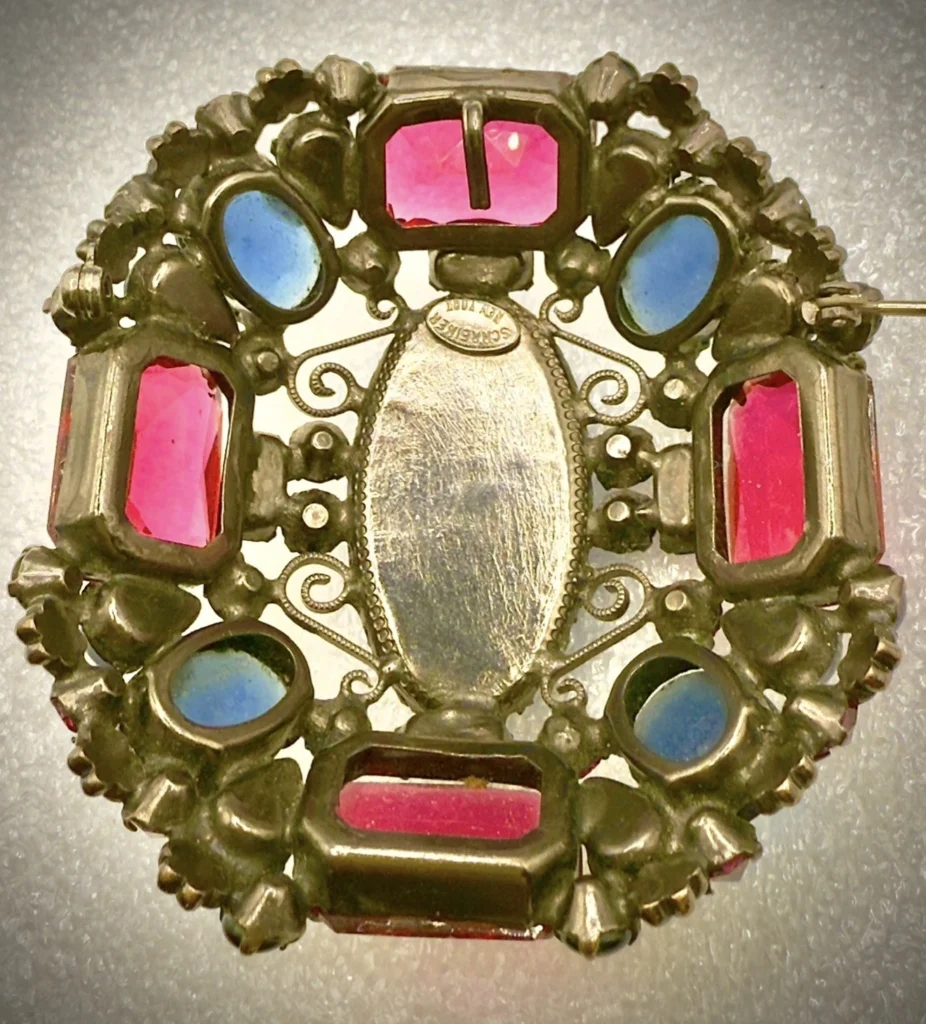 Les marques Schreiner peuvent être délicates car de nombreuses pièces ne sont pas signées, mais une fois marquées, vous pouvez voir SCHREINER ou Schreiner New York. Les collectionneurs adorent Schreiner pour ses montures en pierre inhabituelles et sa construction audacieuse et superposée. Un indice courant est l’utilisation de pierres inversées, où un strass est serti avec la pointe tournée vers l’extérieur au lieu du côté plat. Vous remarquerez peut-être également une ferronnerie très robuste et beaucoup de profondeur dans la conception.