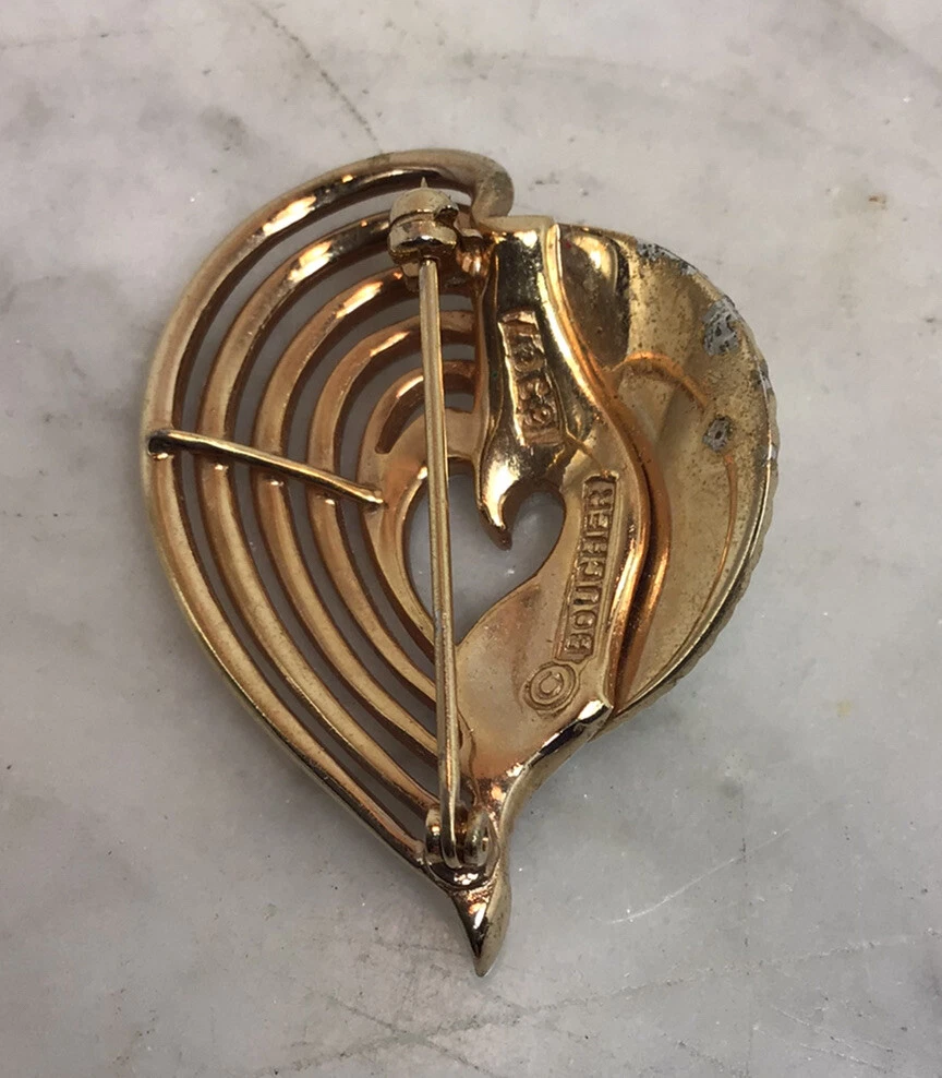 Vérifiez le dos de l’épingle ou le fermoir, car la quincaillerie Boucher est souvent solide et bien placée. Les strass sur les pièces Boucher peuvent paraître plus raffinés et les motifs semblent généralement intentionnels plutôt que surpeuplés. Recherchez un placage uniforme et un minimum de taches sombres dans le métal, en particulier autour des joints. Si vous trouvez une broche signée Boucher en bon état, elle a souvent tout de suite l’air élégante.