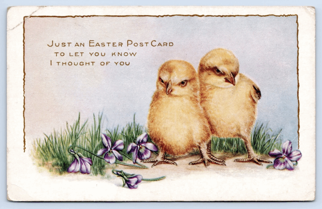 Les cartes postales Whitney Made de Worcester sont un choix solide pour les collectionneurs printaniers car elles portent souvent des scènes de vacances lumineuses et des surfaces en relief. Une carte de poussins et de violettes datant d’environ 1910 est un bon point d’entrée pour tous ceux qui aiment le papier de Pâques antique sans payer les prix les plus élevés de Tuck. Le design est doux et joyeux, ce qui explique en partie pourquoi Whitney suscite toujours un intérêt constant. Pour ce type de carte, une estimation du marché d’environ 4 $ à 6 $ est raisonnable.