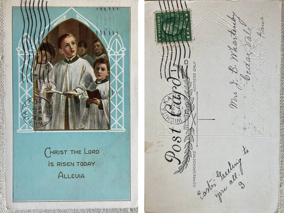 Ce type de carte fonctionne bien dans une collection printanière car elle ajoute de la variété aux thèmes du poussin et du lapin. Cela permet également de montrer comment le papier de Pâques du début des années 1900 couvrait à la fois des sujets sacrés et décoratifs. Le prix dépend généralement de la propreté des coins et de la brillance de la surface. Un message écrit ne nuit pas toujours beaucoup à la valeur si l’image de couverture est bien présentée.