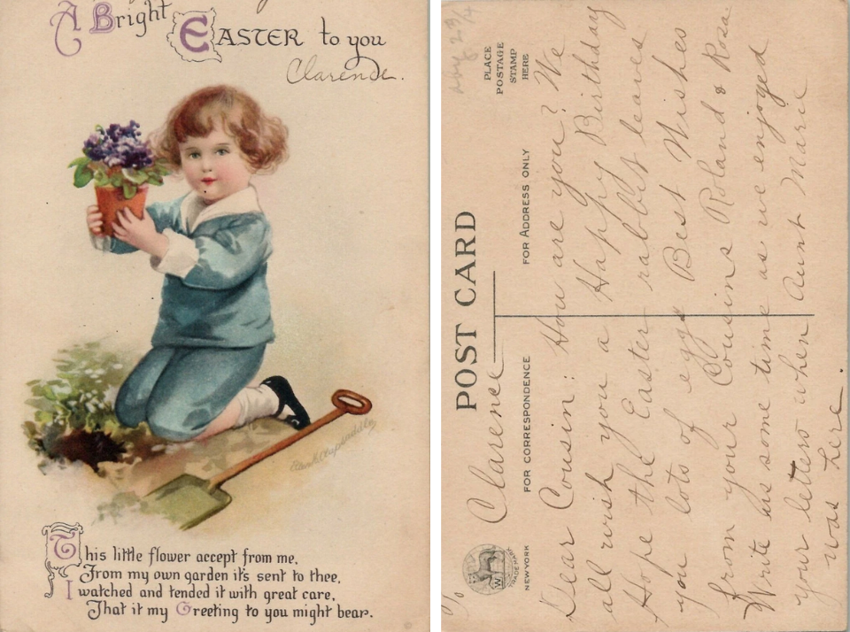 Un garçon en bleu avec des violettes d’Ellen Clapsaddle donne à une collection printanière une sensation plus douce et plus digne d’un livre de contes. L’exemple de Wolf Publishing datant d’environ 1910 présente l’enfant centré dans une simple scène de Pâques, ce qui le rend facile à afficher et à apprécier. Les collectionneurs aiment souvent les cartes comme celle-ci parce que l’art est chaleureux sans être trop occupé. Une estimation raisonnable pour un se situe entre 10 et 17 dollars.