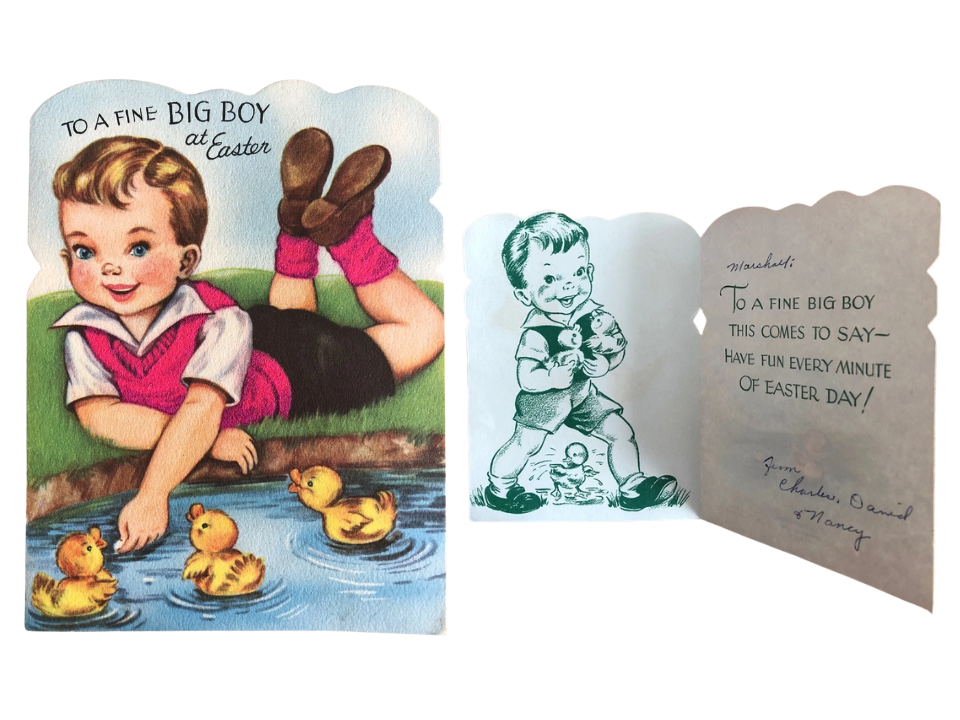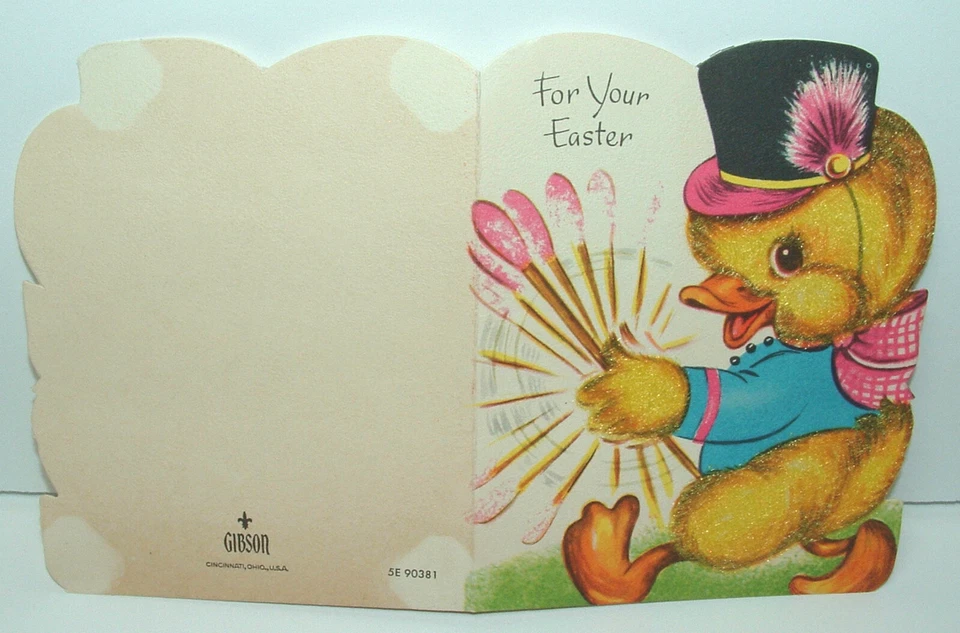 Dans les années 1950, Gibson publiait encore des cartes de Pâques avec des flocages doux et des scènes familiales joyeuses. Un petit garçon avec un motif de canetons de cette décennie en est un exemple simple mais très sympathique. Ces cartes fonctionnent bien pour les collectionneurs qui aiment l’art des fêtes centré sur les enfants et les surfaces texturées. Une estimation de la juste valeur est d’environ 6 $ à 9 $.