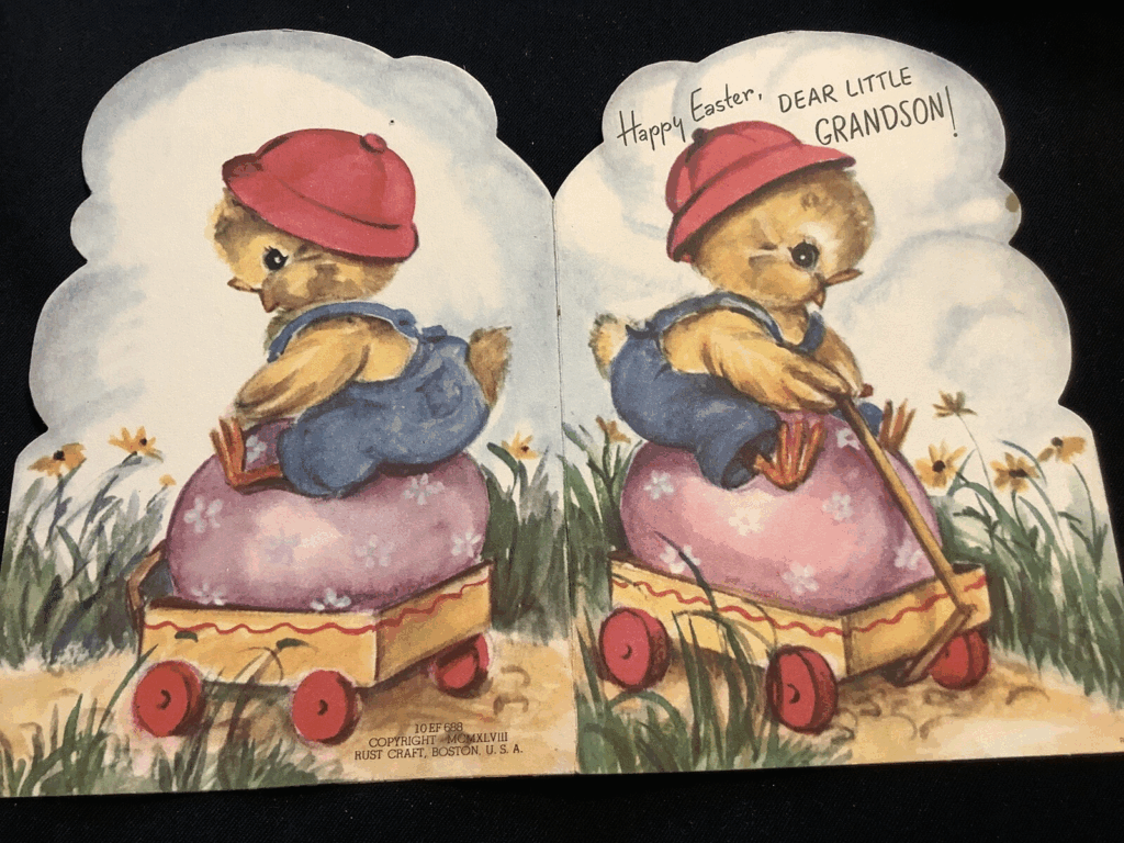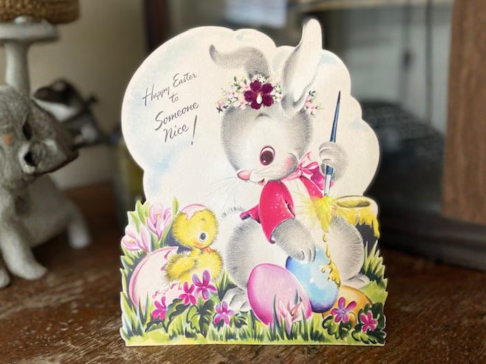 Une carte de Pâques découpée Rust Craft des années 1950 est un très bon article en papier printanier lorsque vous voulez forme et couleur en une seule pièce. Le canard avec un gros œuf et un design de chariot semble ludique et distinctement du milieu du siècle. Les cartes découpées sont souvent plus décoratives que les cartes pliées standard, ce qui les aide à se démarquer sur un petit présentoir. Une estimation réaliste pour celui-ci est d’environ 7 à 10 dollars.
