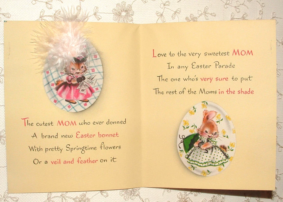 Norcross est un bon nom pour les cartes de vœux printanières car elle est souvent utilisée avec des touches décoratives supplémentaires comme des plumes, des rubans et de petites pierres. Une carte Mother Bunny des années 1950 avec un strass bleu et un bonnet en plumes blanches est un bon exemple de ce style. Des pièces comme celle-ci ont un aspect festif, contrairement aux cartes imprimées simples. Une estimation juste du marché tourne autour de 10 à 15 dollars pour une copie plus propre.