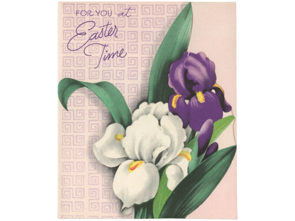 Les cartes de Pâques American Greetings de la fin des années 1950 ou du début des années 1960 sont de bons choix pour les collectionneurs qui aiment les œuvres florales du milieu du siècle. L’exemple de lys découpés montre que l’entreprise a utilisé des images saisonnières élégantes ainsi qu’un motif en papier façonné. Cela semble plus propre et un peu plus formel que certaines cartes d’enfants et de lapins de la même époque. Une valeur actuelle d’environ 13 à 15 dollars est une estimation juste.