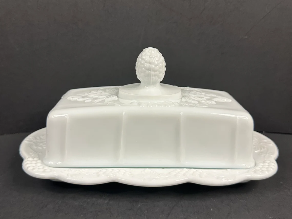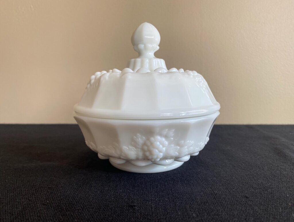 Les petites boîtes couvertes se vendent bien au printemps, surtout lorsqu’elles proviennent d’un fabricant connu comme Westmoreland. Cette boîte feuilletée a le motif de raisin que les collectionneurs aiment, et le couvercle lui donne un aspect fini qui compte beaucoup pour la valeur. Les morceaux de raisin lambrissés sont généralement datés de 1940 à 1984. La valeur marchande d’un exemple complet est souvent d’environ 25 $ à 35 $.