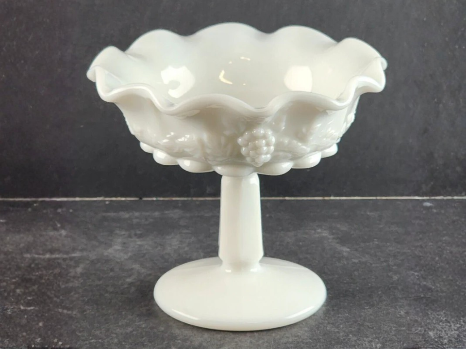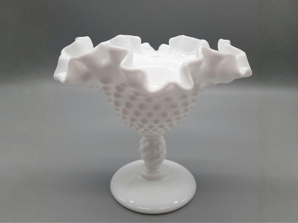 La compote ronde est un autre favori de Fenton qui quitte souvent rapidement les étagères antiques au printemps. Son corps incurvé et sa base surélevée lui confèrent un aspect doux qui convient aux tables saisonnières. La plupart des guides de collectionneurs placent cette ligne à partir de 1948. Aujourd’hui, la juste valeur marchande est généralement d’environ 18 à 28 dollars.