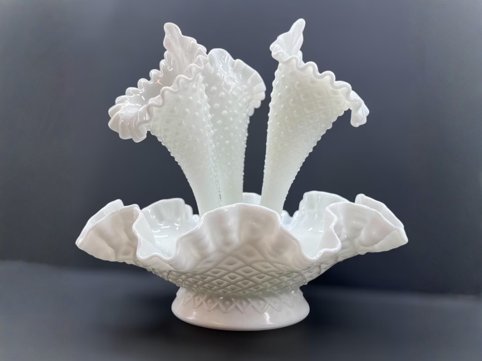 Ensemble Epergne deux pièces en verre à lait Fenton Hobnail
