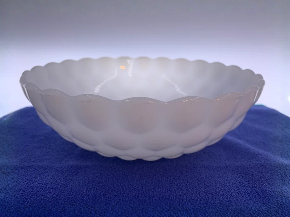 Le verre à lait Anchor Hocking Bubble a une surface plus douce et plus ronde que de nombreux autres motifs pressés, ce qui lui confère un large attrait. Le bol à légumes rond est utile pour servir, même s’il reste joli à exposer lorsqu’il est vide. Cette ligne est généralement datée de 1934 à 1965. Une valeur courante est d’environ 25 $ à 35 $.