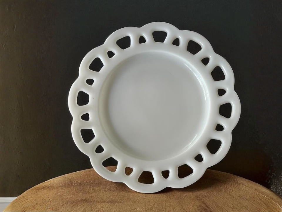 Les assiettes de service surélevées se vendent très bien au printemps, et cette assiette à tourte Anchor Hocking a beaucoup d’atouts. Le bord en dentelle lui donne un look habillé, tandis que le verre blanc l’empêche de paraître trop formel. La plupart des exemples sur le marché rapportent désormais entre 60 et 75 dollars. Il est généralement traité comme une pièce de service en verre de lait du milieu du siècle.