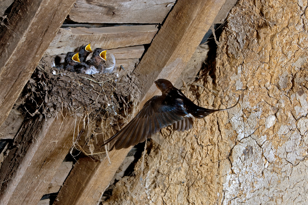 Même lorsque le nid se trouve au-dessus d’une porte ou à proximité d’une zone de travail, il ne faut pas le déranger. Balayer autour, frapper contre le mur ou rester dessous pendant de longues périodes peut inquiéter les oiseaux. Le nettoyage et les réparations peuvent attendre que le nid ne soit plus utilisé. D’un peu plus loin, on peut encore apprécier le va-et-vient des hirondelles.