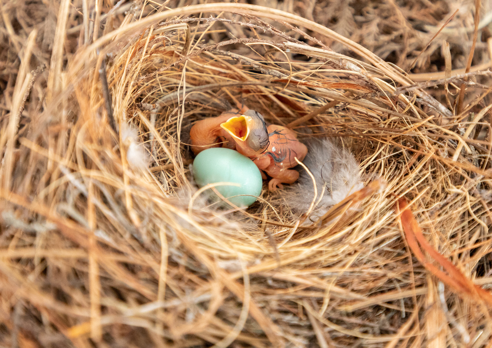 Dans les cours et les champs ouverts, les merlebleus de l’Est élèvent souvent leurs petits dans des nichoirs ou dans des cavités d’arbres. Leurs nids sont faits d’herbes sèches et d’aiguilles de pin soigneusement placées dans l’espace protégé. Vous remarquerez peut-être d’abord les adultes transportant de la nourriture plutôt que de voir le nid lui-même. Ce mouvement de va-et-vient constant est généralement l’indice.